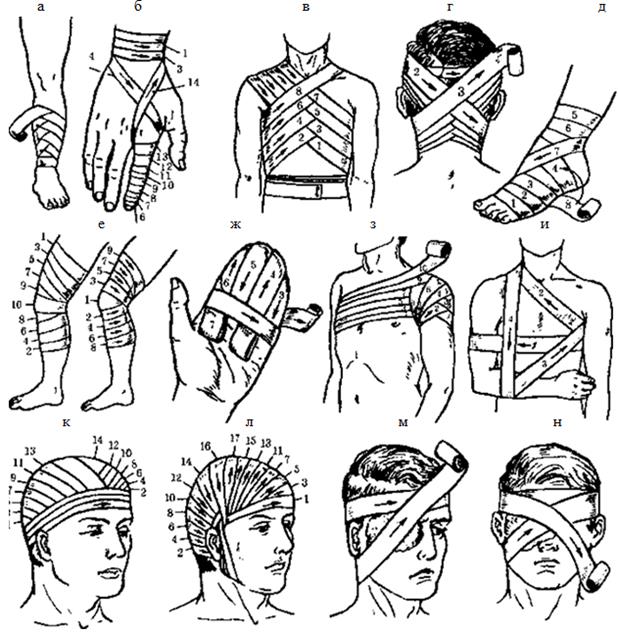 наложение бинтов и рисунки ниже):